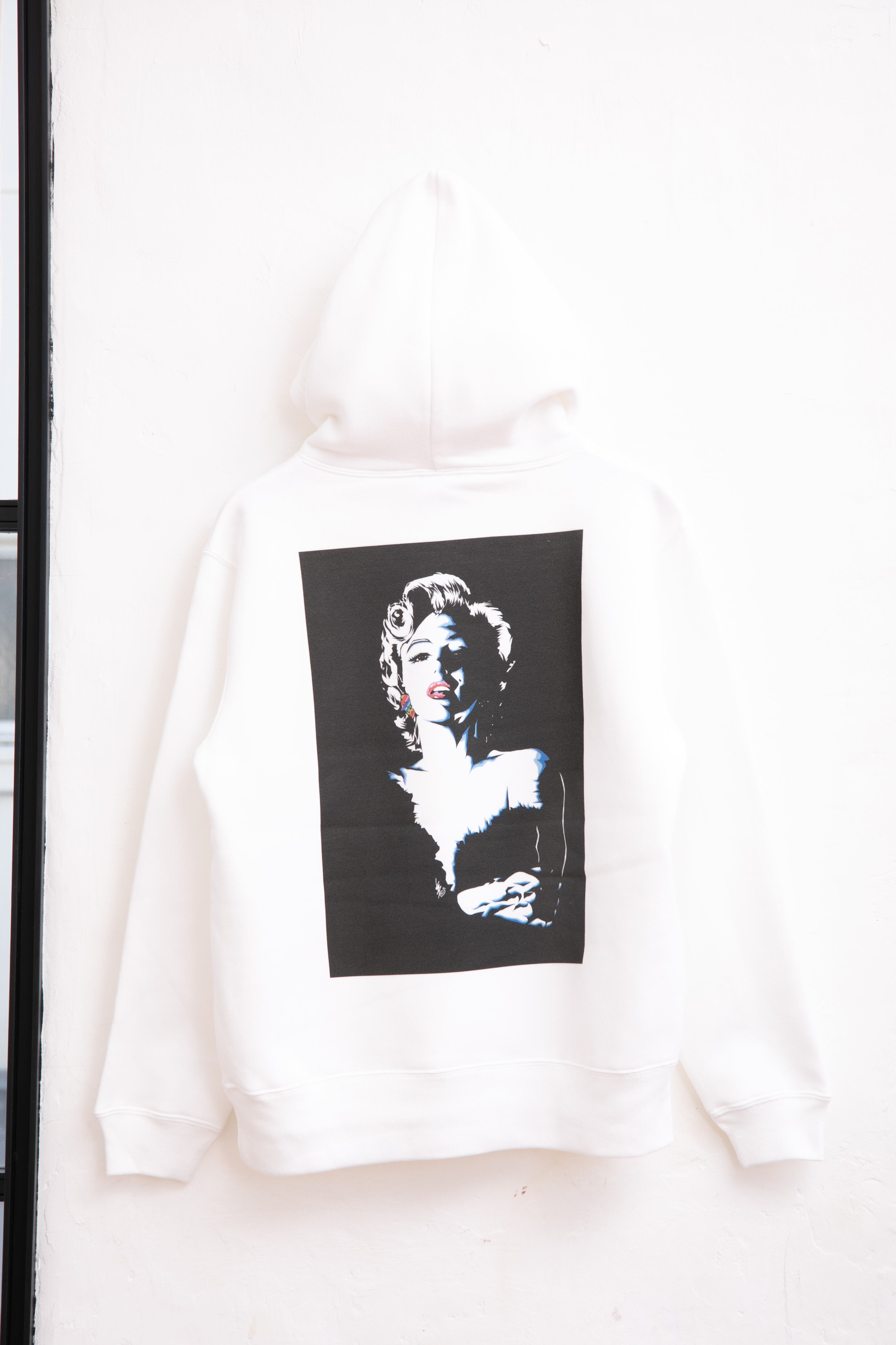絵師トモミイラスト マリリンモンロー青 パーカー白色 Mサイズ レディース、メンズ [即納]